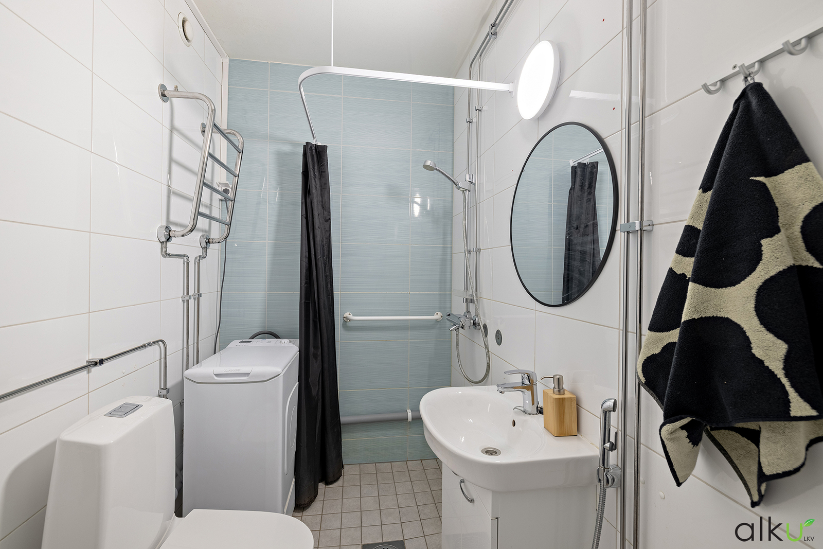 Vaalea kylpyhuone, josta löytyy paikka pesukoneelle. Kylpyhuoneen yhteydessä myös wc.
