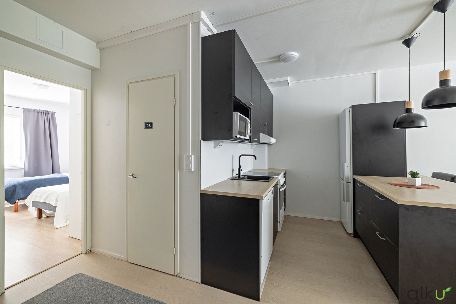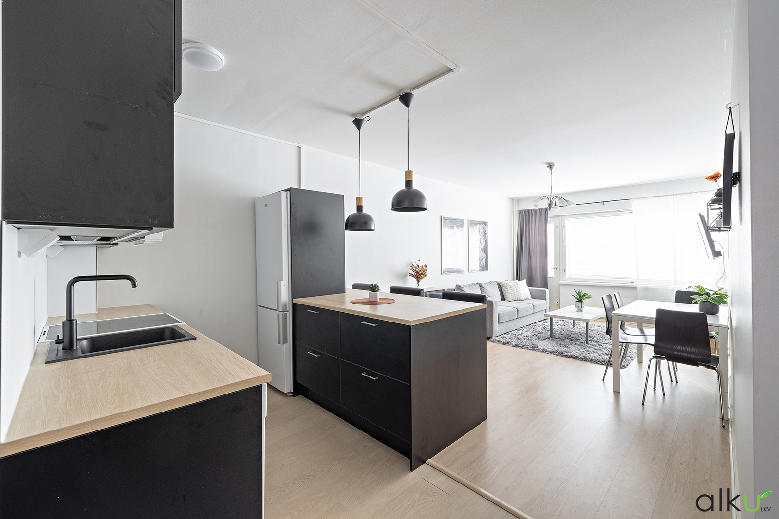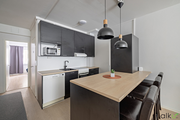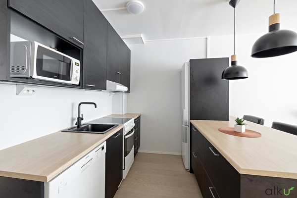 Upea remontoitu moderni keittö, jonka saarekkeen äärellä on kiva viettää aikaa perheen kanssa! Keittiöstä löytyy tummat kaapistot ja vaaleat tasot, sekä runsaasti tilaa tavaroillesi. Vaatehuoneen ja olohuoneen välinen seinä purettu ja keittiö siirretty vaatehuoneen tilalle 2023.