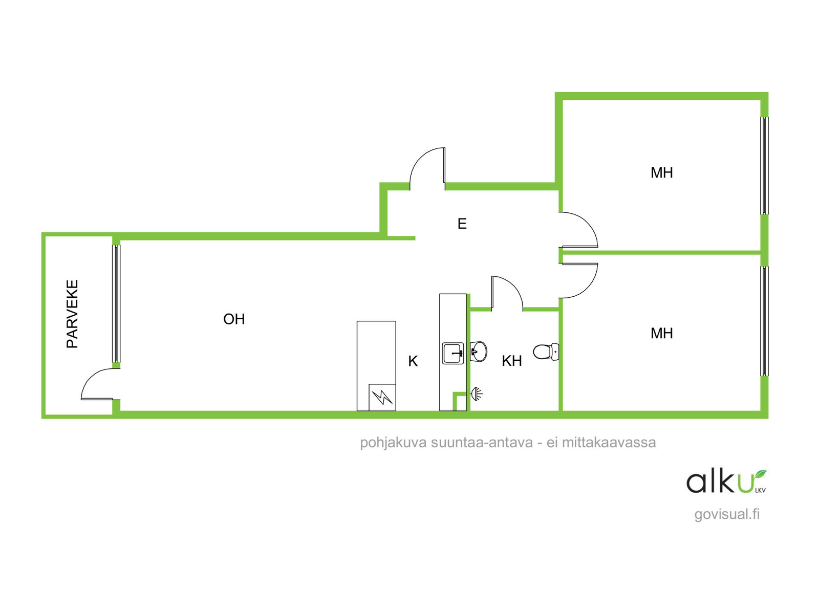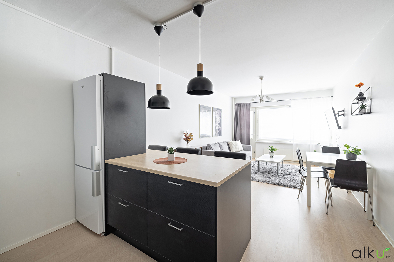 Avarapohjainen ja valoisa läpitalon kolmio omalla parvekkeella.