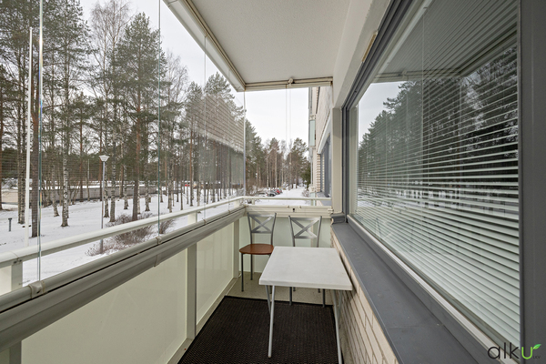 Valoisasta, tilavasta olohuoneesta on käynti lasitetulle parvekkeelle, joka toimii lisähuoneena aikaisesta keväästä pikälle syksyyn! Kodin makuuhuoneisiin on käynti eteisaulasta. Molemissa makuuhuoneissa on hyvin säilytystilaa kaapistoissa.