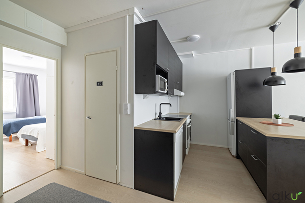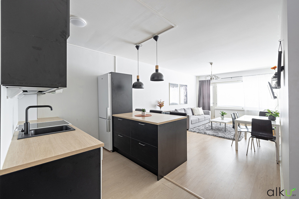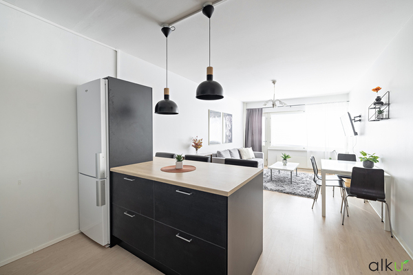 Suuri eteistila toimii kodin tilojen jakajana; eteisestä on kulku kodin kaikkiin tiloihin. Tyylikäs musta keittio on viihtyisä, ruoanlaiton yhteydessä voit nauttia sekä perheen että vieraiden seurasta. Käytännöllinen saareke tuo mukavasti tasotilaa ja sen äärellä on mukava ruokailla.