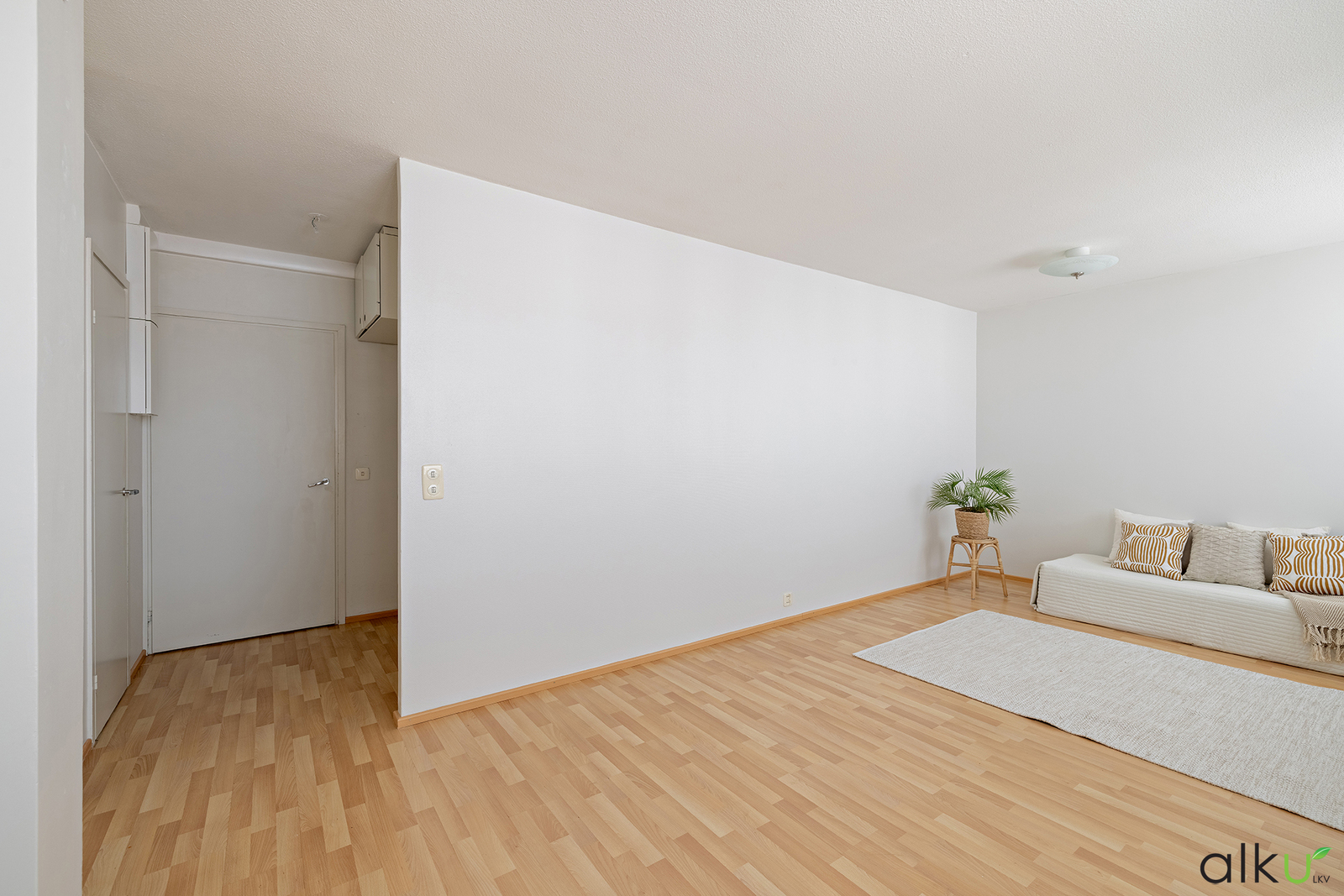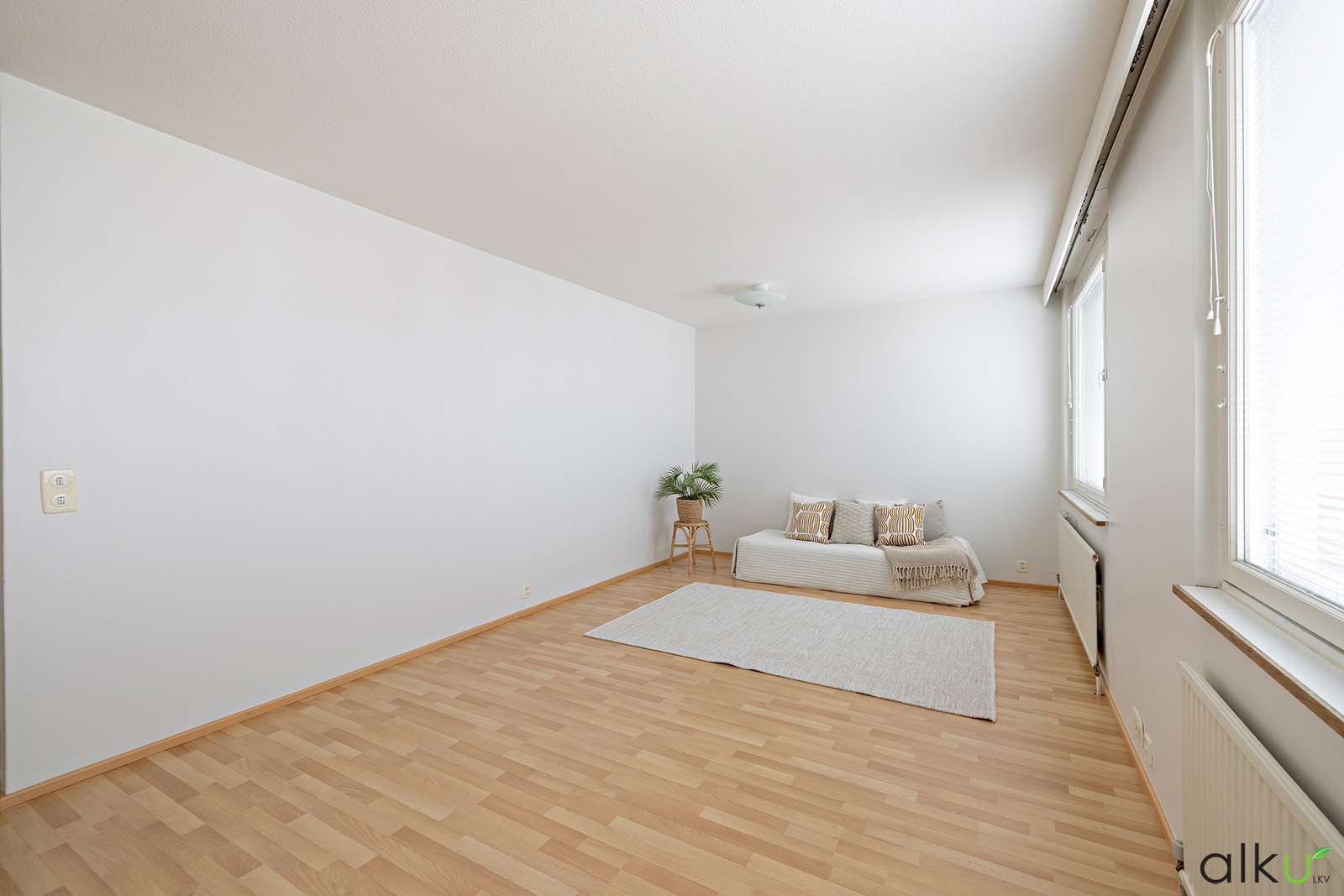 Tässä kodissa on suuret ja valoisat huoneet. Tilavaa olohuonetta on ilo sisustaa mieleisekseen. Sohvaryhmän lisäksi tilaan sopii hyvin suurempikin ruokailuryhmä tai vaikkapa työtila. Olohuoneesta voisi halutessa eriyttää toisen makuuhuoneen.