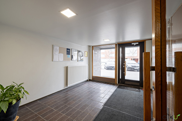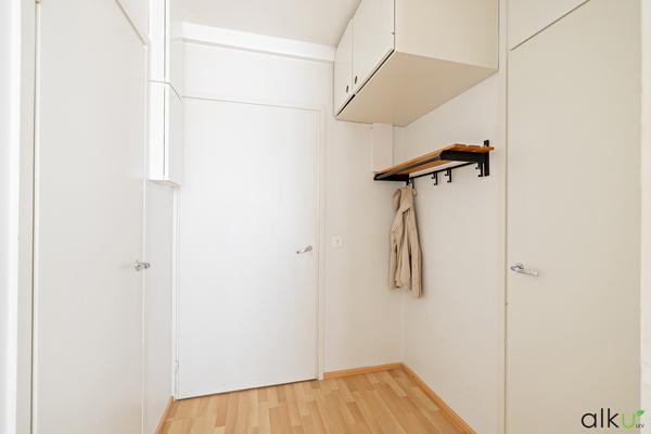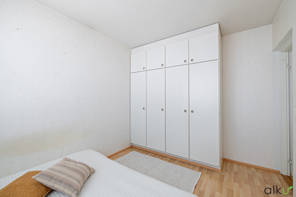 Keittiön vierellä on makuuhuone, jossa vaatesäilytykseen kaapistot. Kylpyhuoneeseen on käynti eteisestä, jossa sijaitsee myös kodin wc. Säilytystilaa on eteisen yhteydessä olevassa vaatehuoneessa.