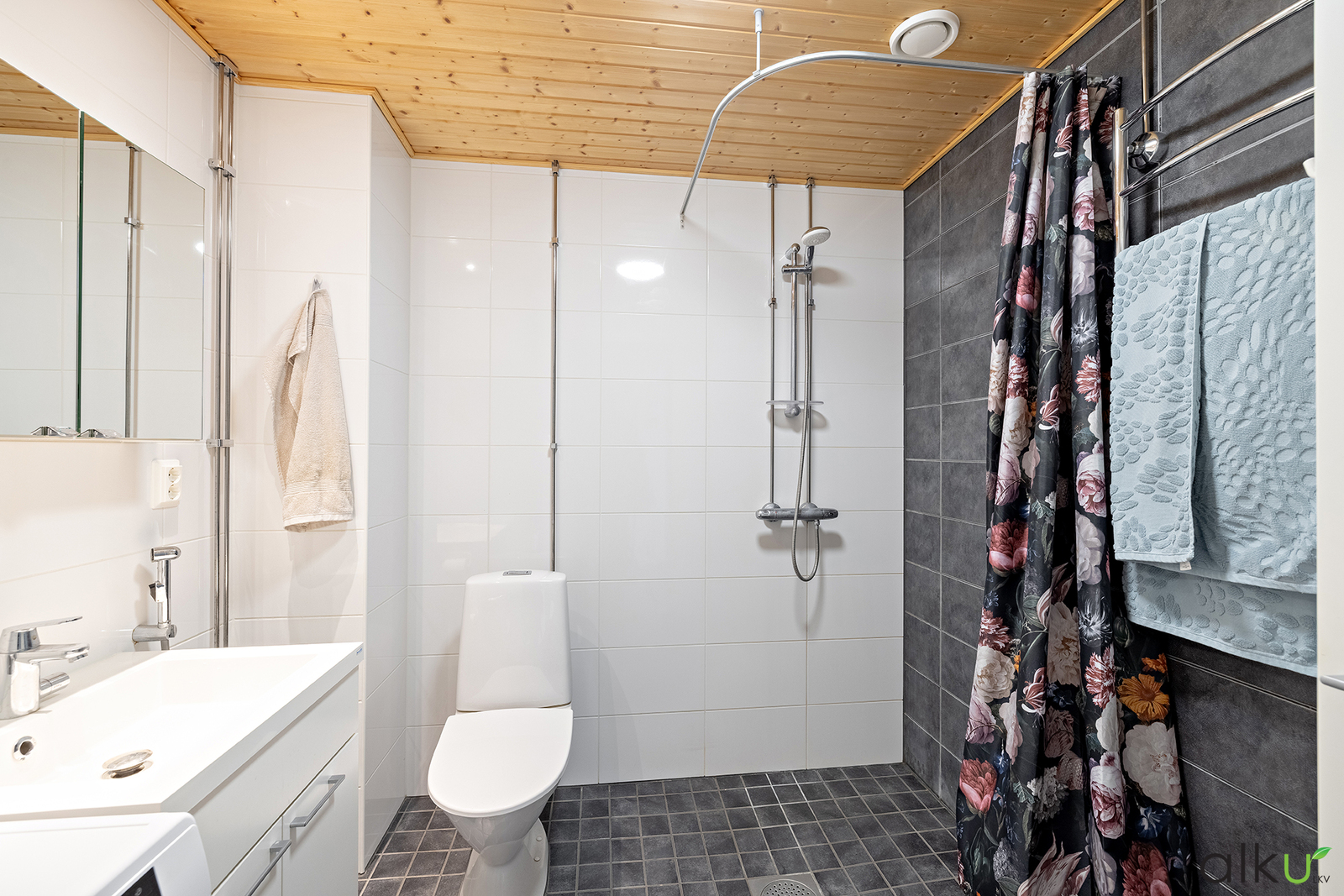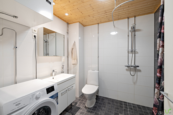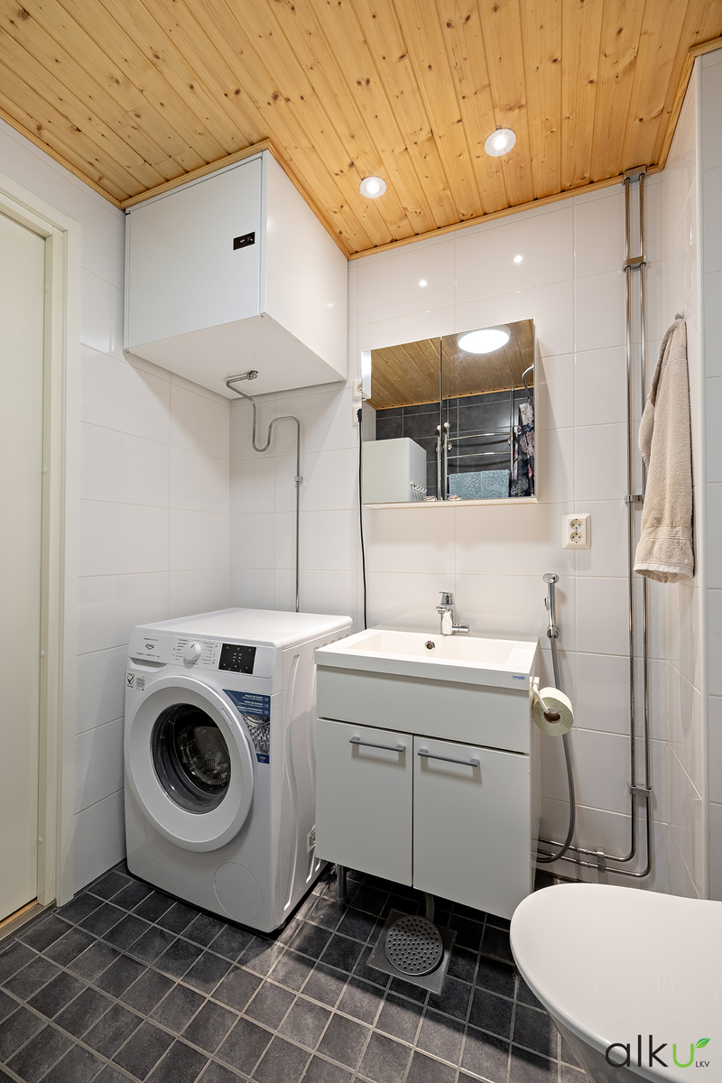 Tilava ja toimiva kylpyhuone on tyylikäs. Kylpyhuoneessa on ajaton värimaailma. Hyvin tilaa myös pesutornille.