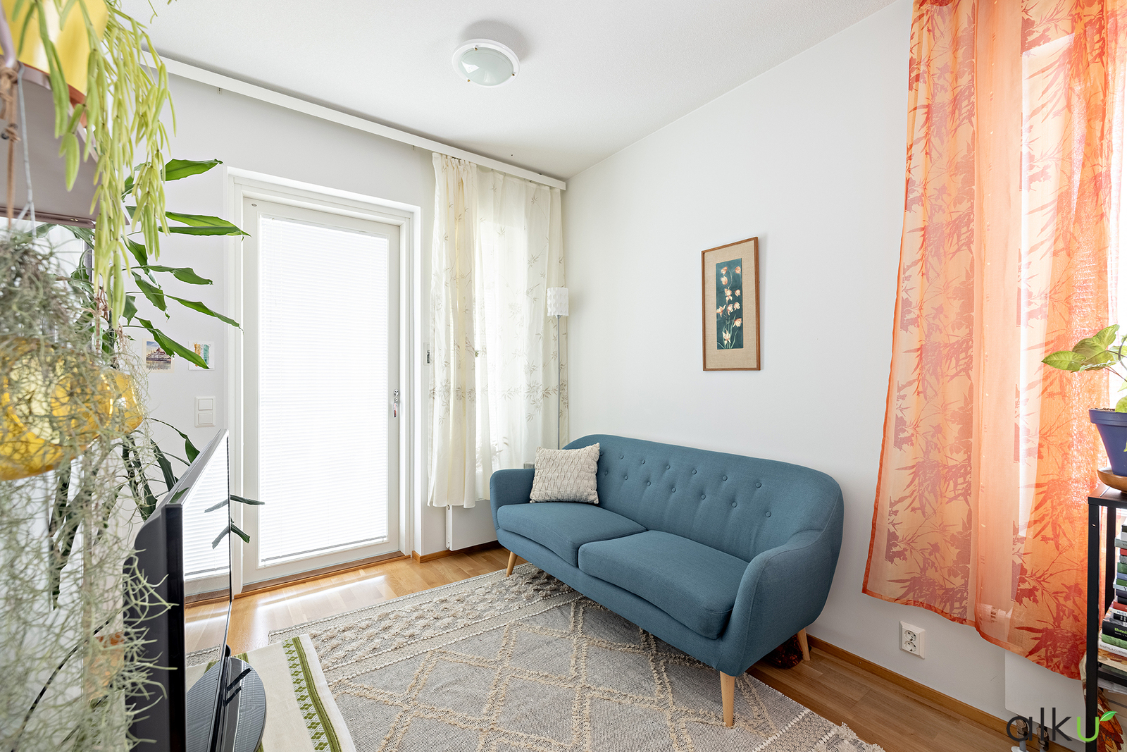 Valoisa ja tilava olohuone on viihtyisä. Seinät ovat valkoiset ja lattiat parkettia. Suurista ikkunoista tulee hyvin valoa tähän kotiin!