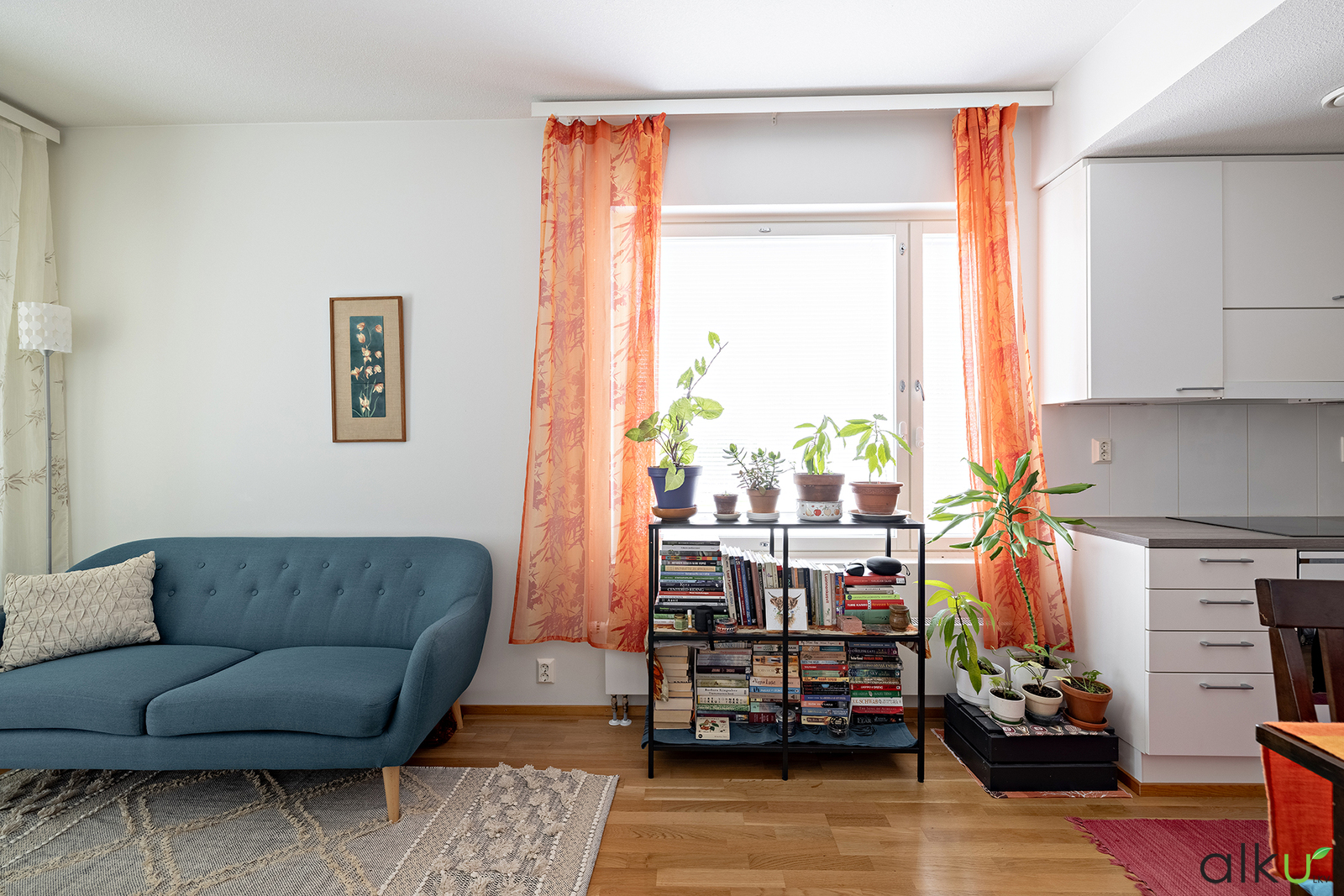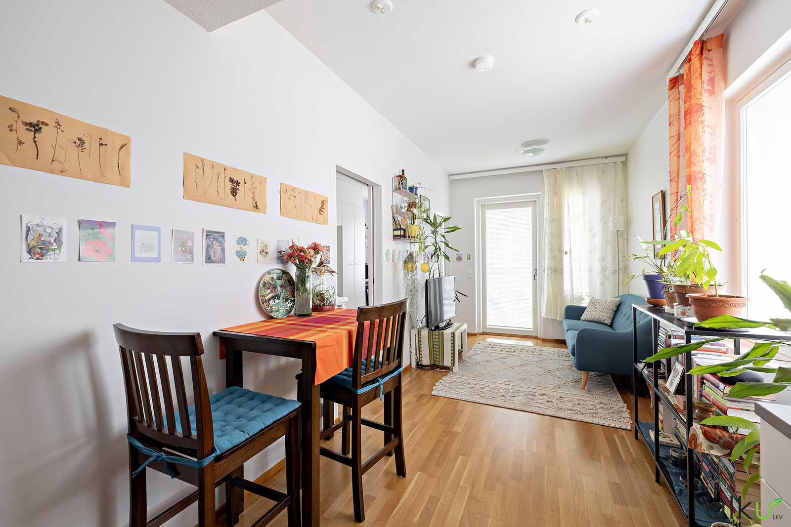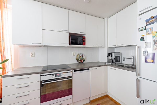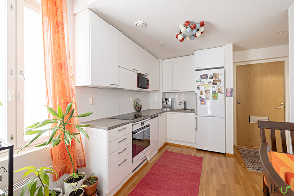 Kodin keskus on keittiön, sekä olohuoneen yhdistelmä, jotka sulautuvat toisiinsa mainiosti. Tässä yhtenäisessä tilassa on kauniit vaaleat pinnat. Hyvänkokoisessa keittiössä kelpaa kokkailla ja nauttia ystävien seurasta. Olohuonetta on ihana ja helppo sisustaa monin eri tavoin. Olohuoneen kautta on käynti kodin lasitetulle parvekkeelle.
