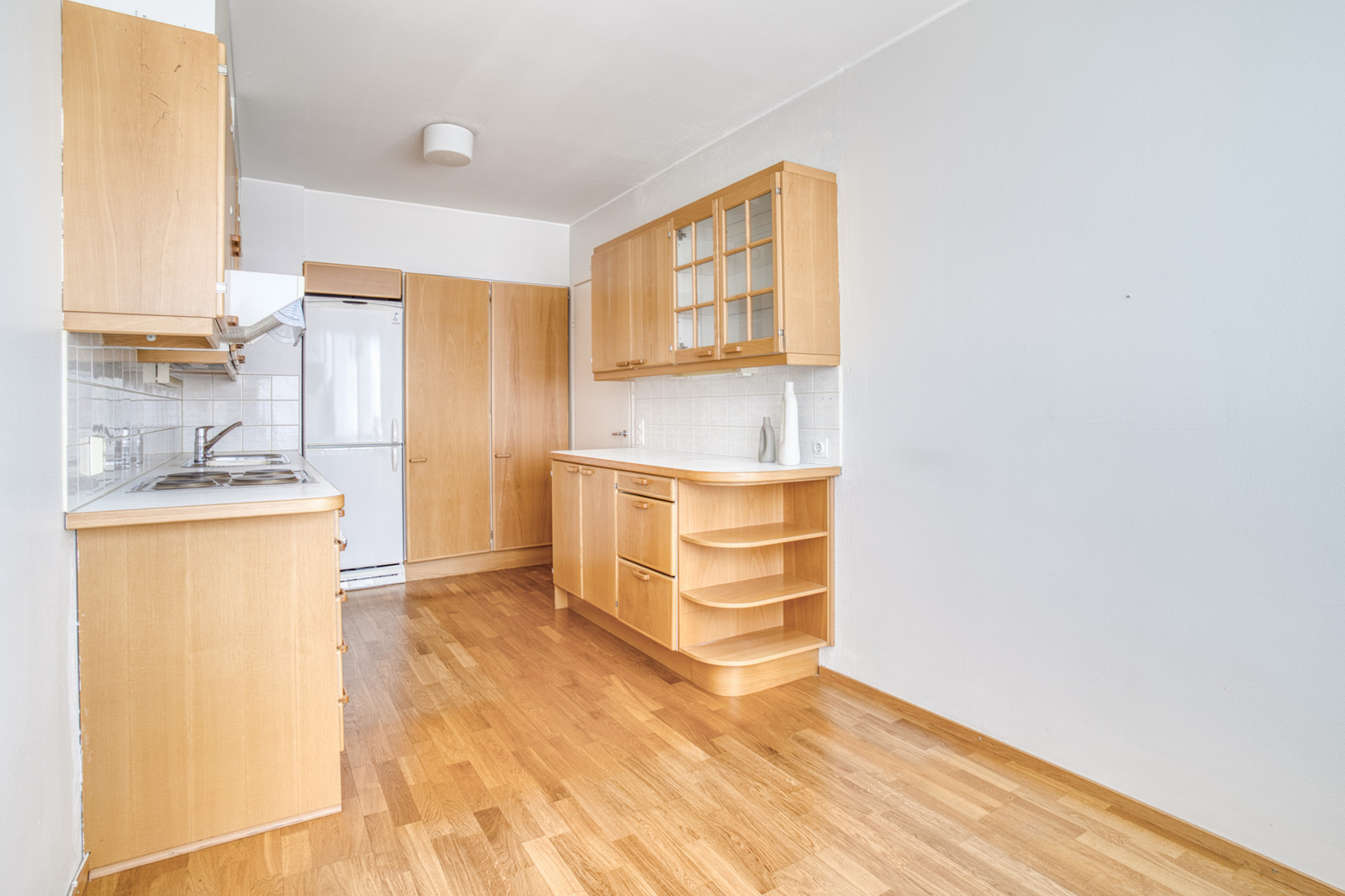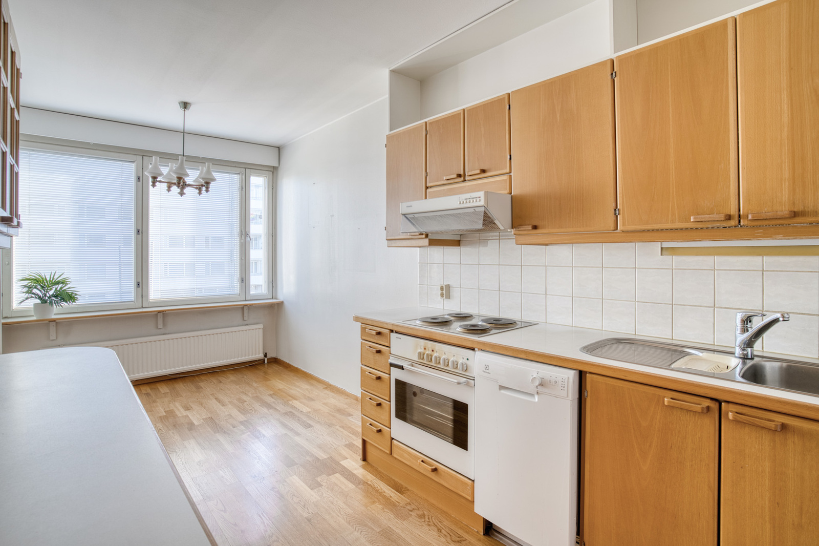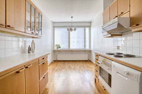 Keittiössä on hyvin taso- sekä kaappitilaa, myös ruokapöydälle hyvä tila ikkunan edessä. Kodinkoneista astianpesukone ei toimi.