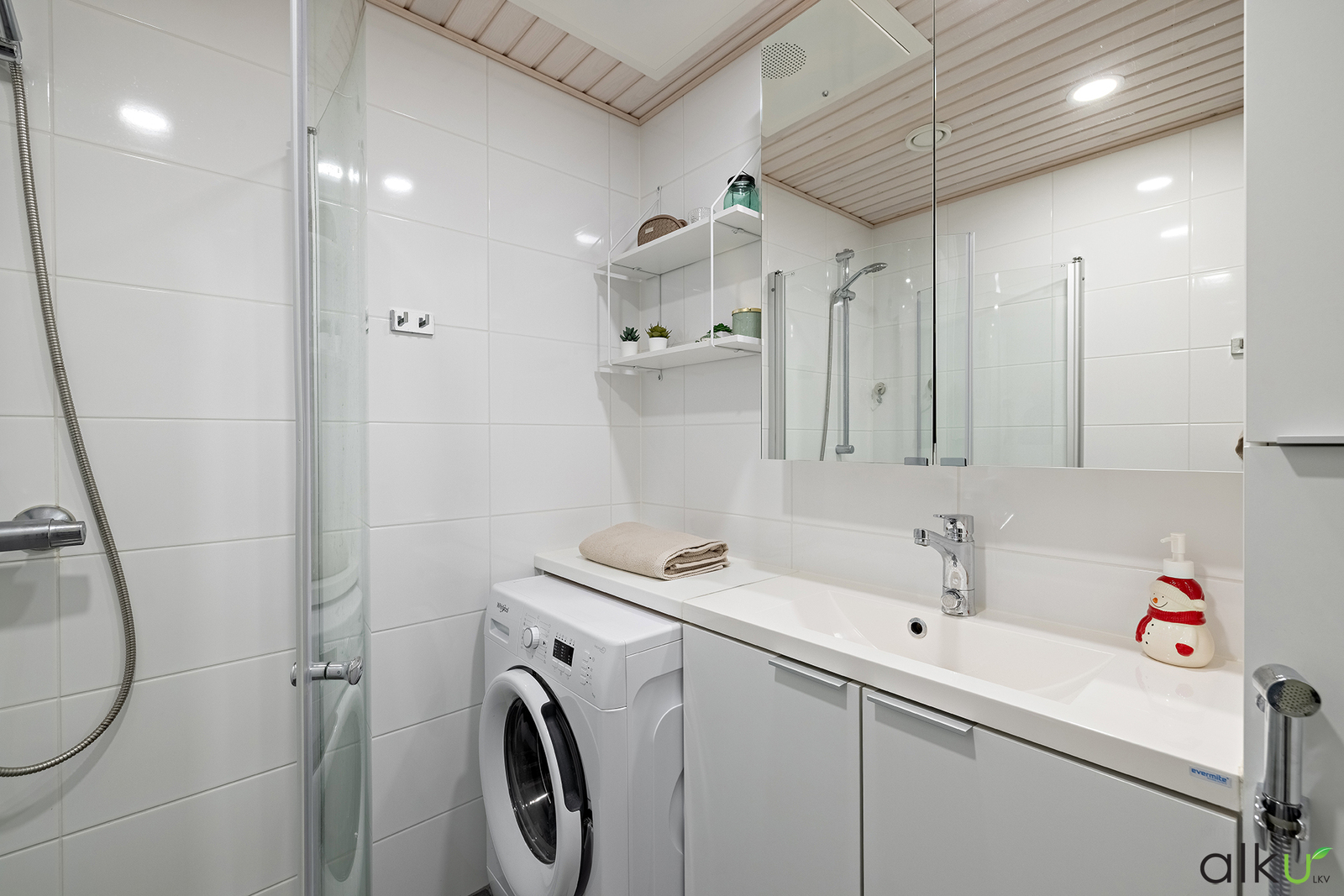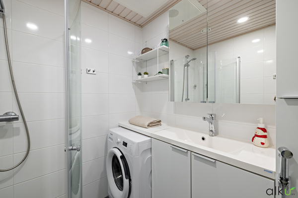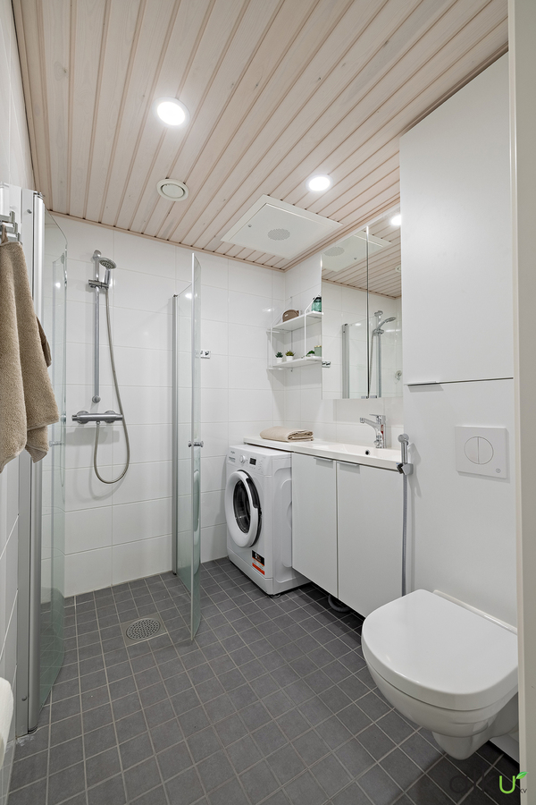 Kodin kylpytiloissa on ajaton värimaailma. Kylpyhuone on toimivan kokoinen ja tilaa on myös pesukoneelle/kuivausrummulle.
