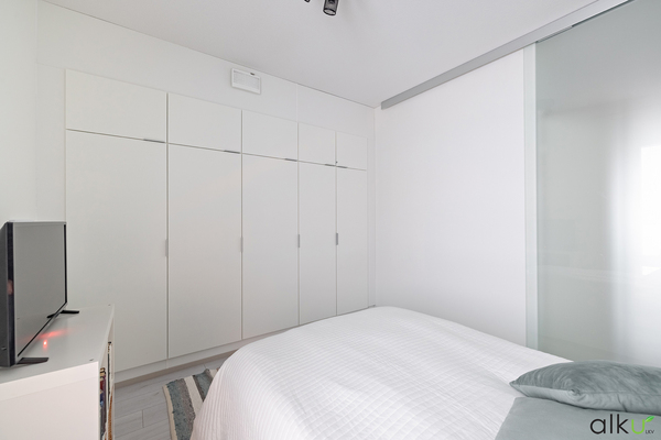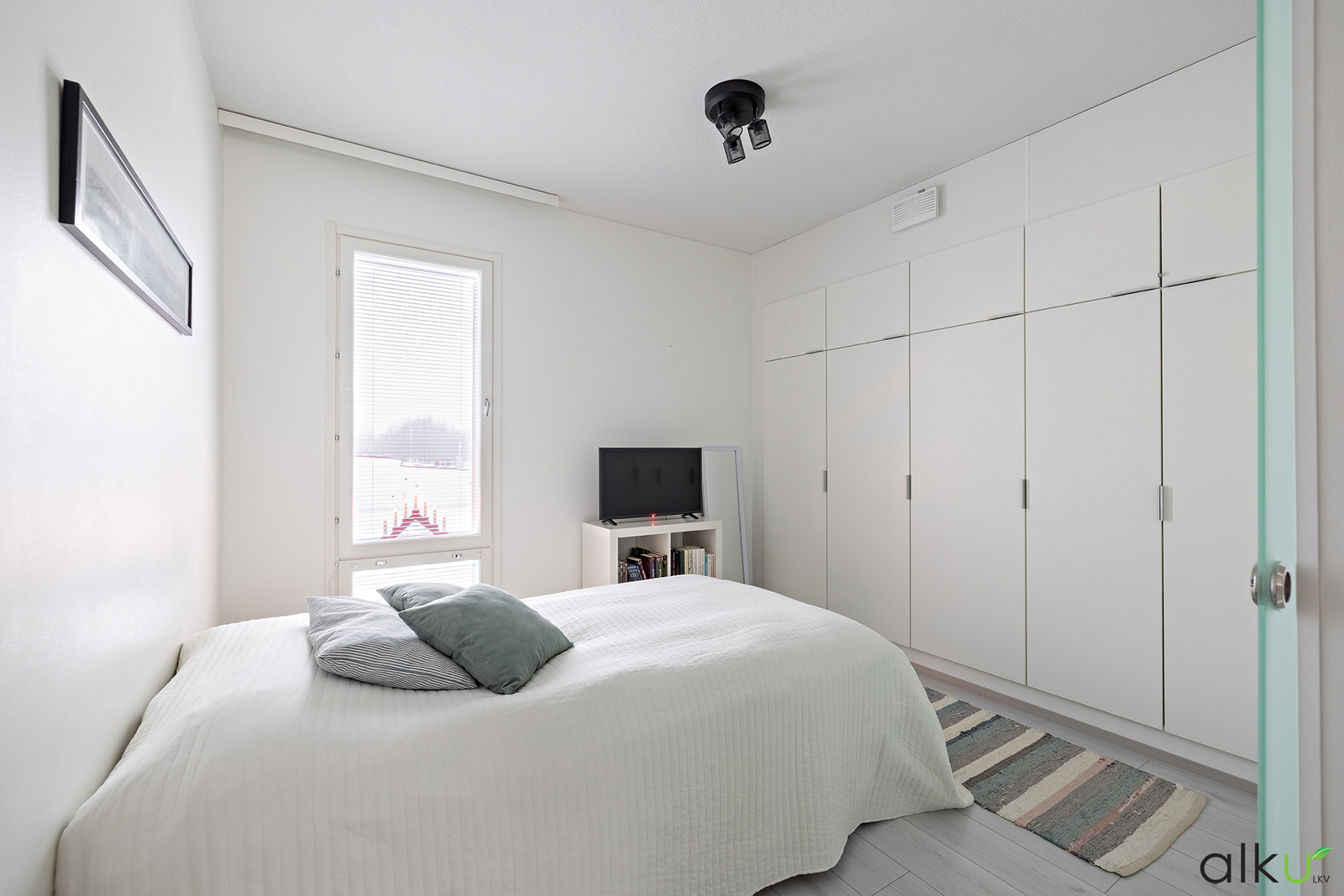 Tilava erillinen makuuhuone, jossa reilusti kaapistoja.