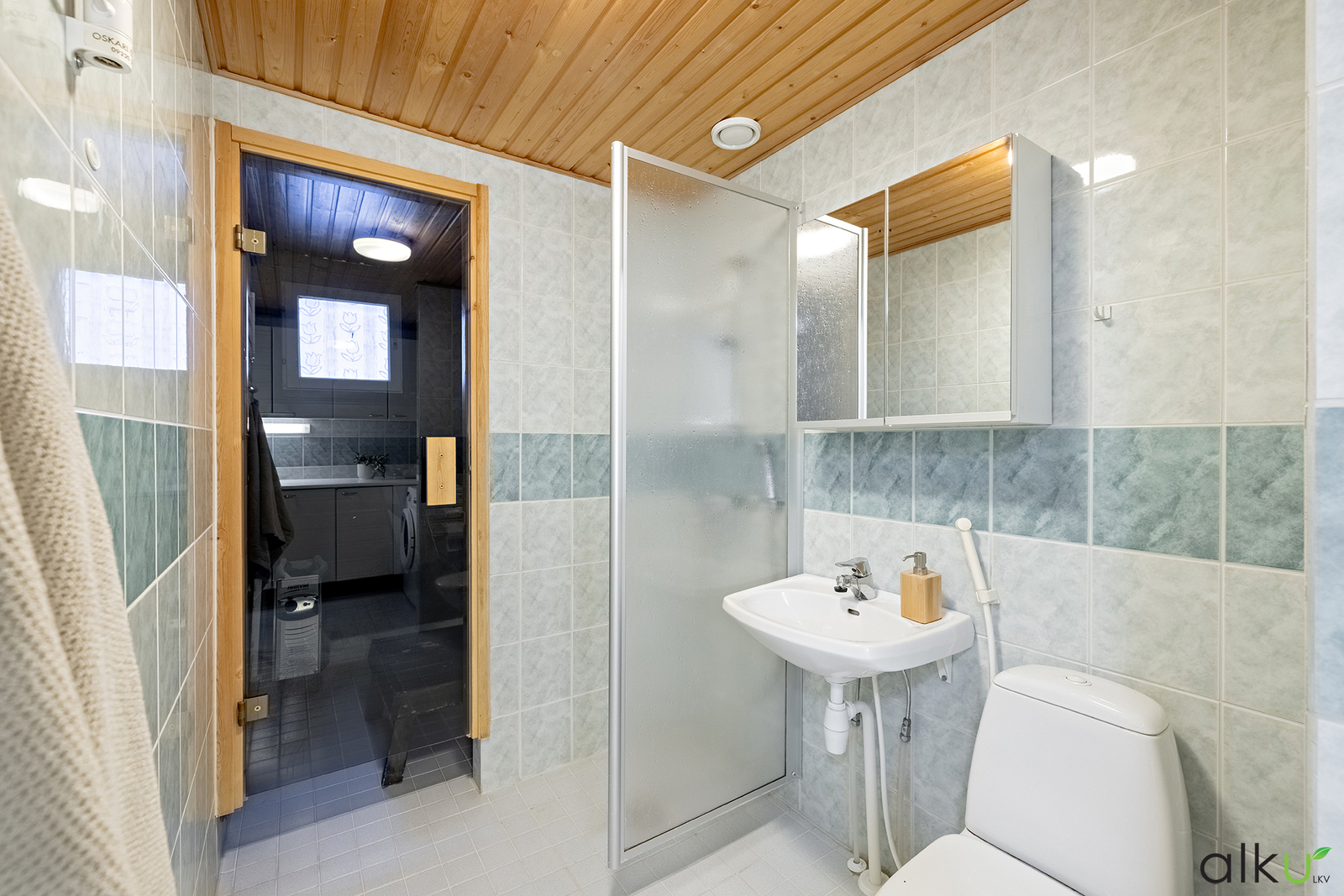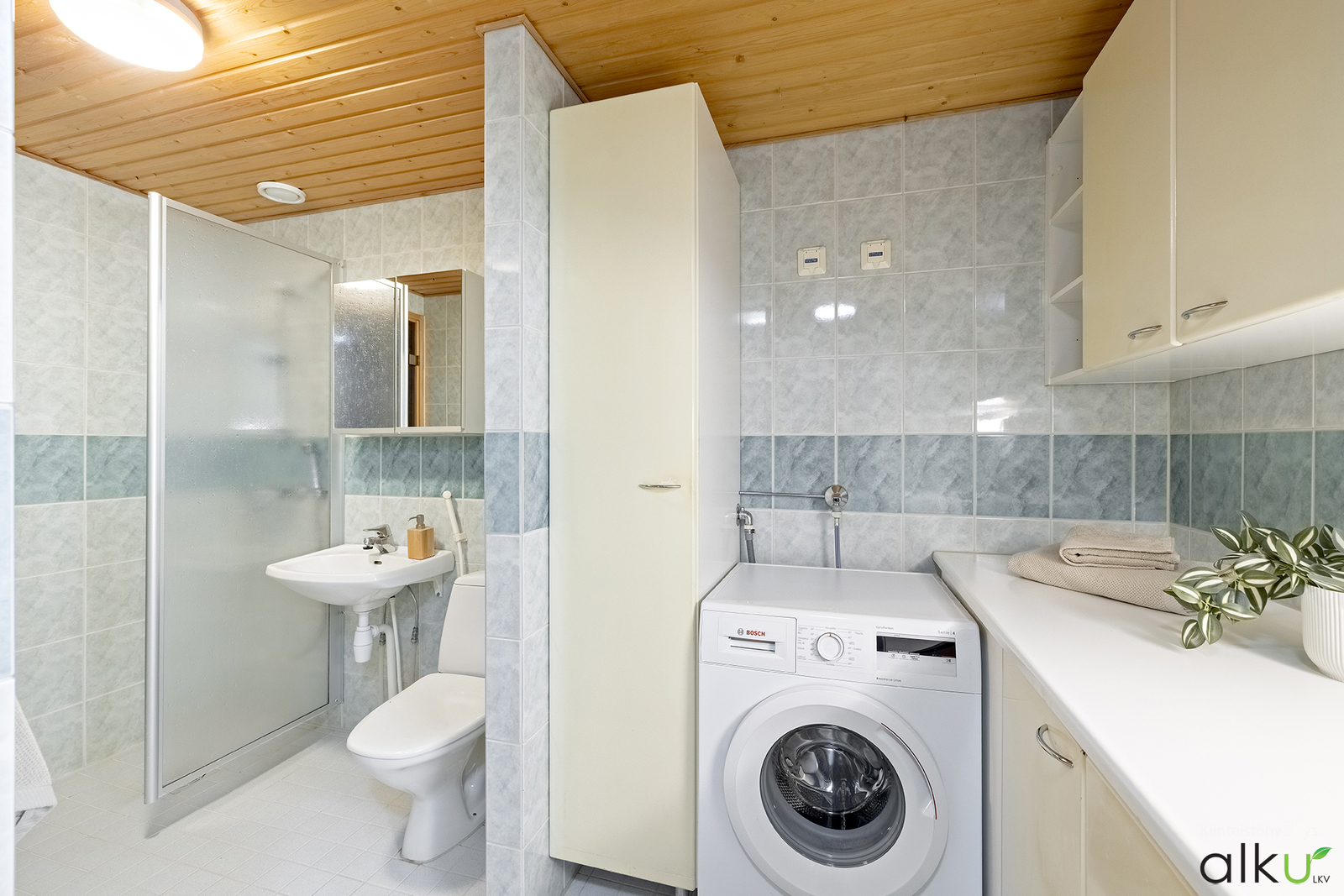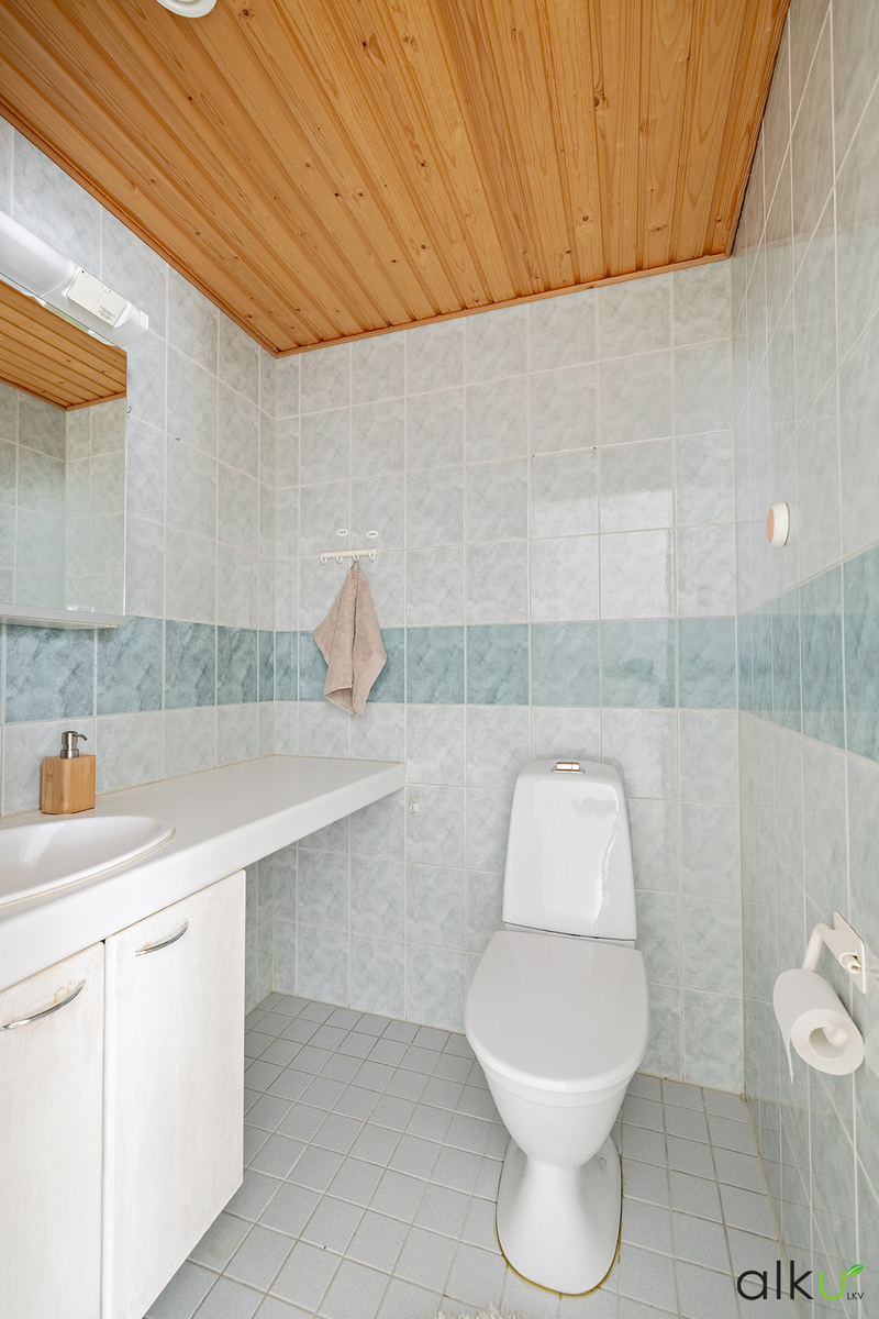 Kauttaaltaan laatoitettu kylpyhuone, jonka yhteydessä sijaitsee myös kodin toinen wc sekä kodinhoitohuone. Kylpyhuoneessa sähköinen lattialämmitys.