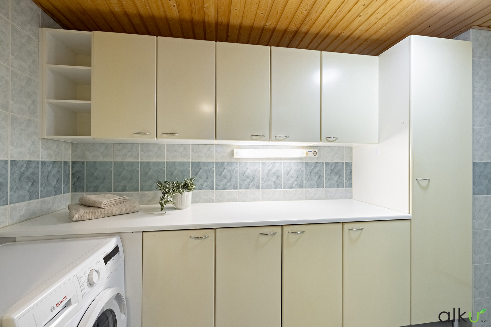 Erillinen kodinhoitotila helpottaa arjen askareita. Hyvin säilytystilaa ja kauniit, vaaleat pinnat.