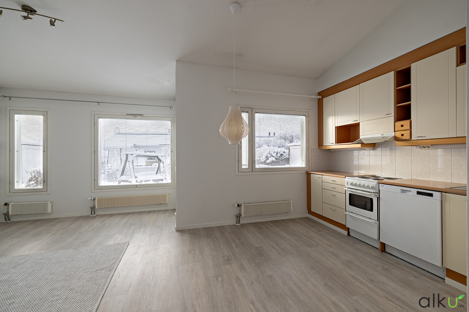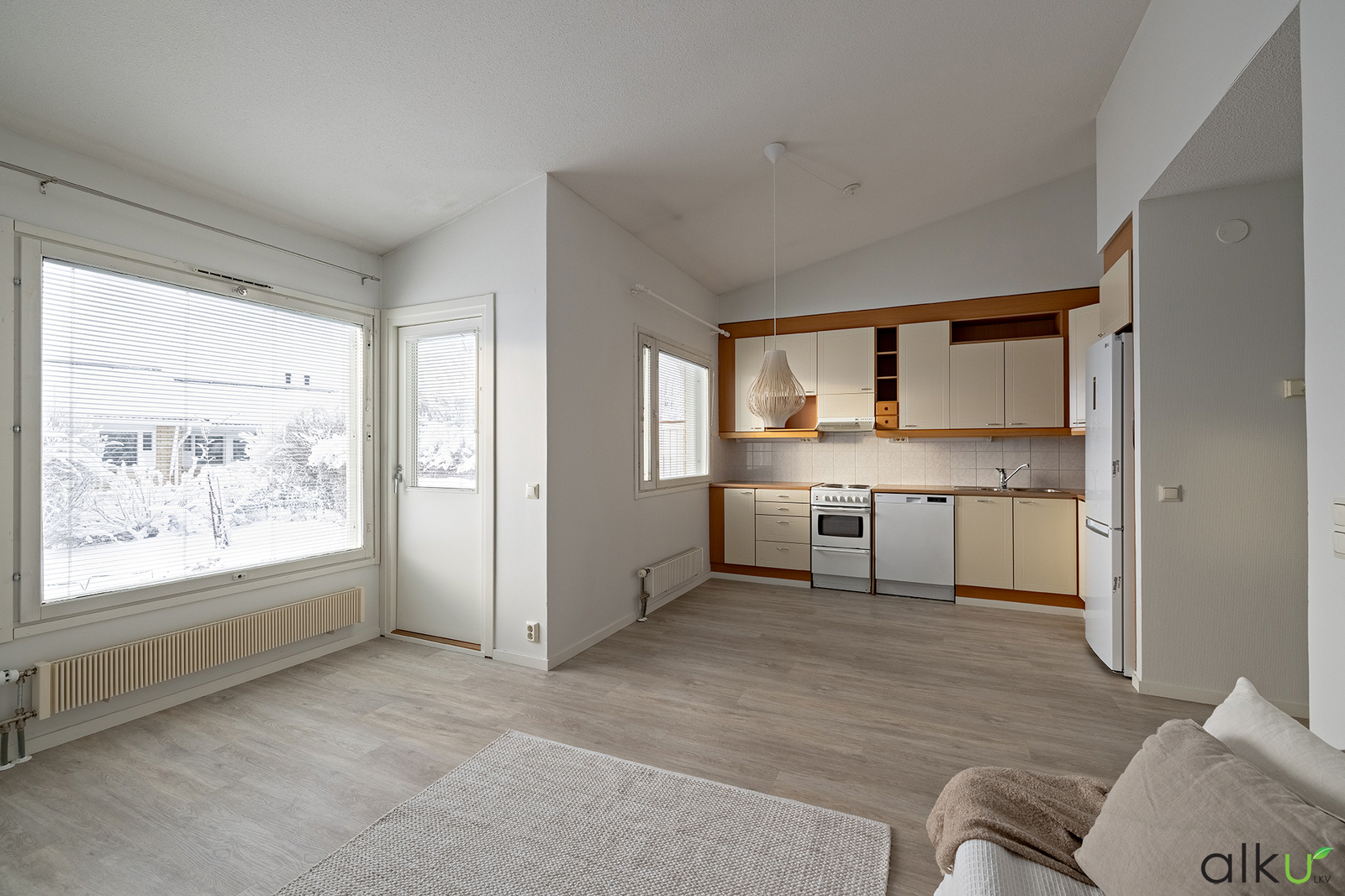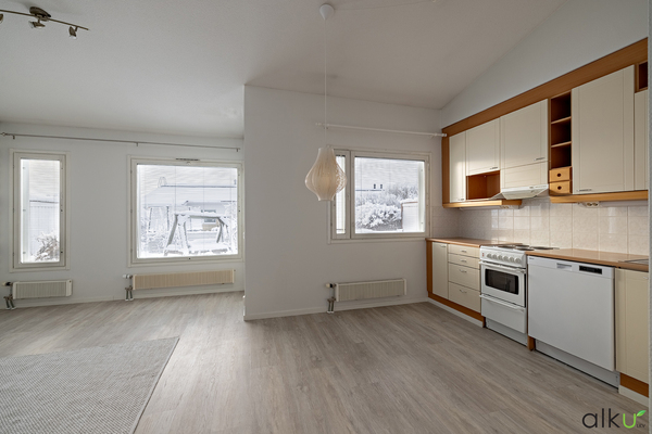 Tilava ja valoisa olohuone yhdistyy keittiöön luoden viihtyisät puitteet. Korotettu katto tuo valoisuutta ja avaruutta. Ikkunasta avautuvat näkymät omalle terassi- ja piha-alueella.
