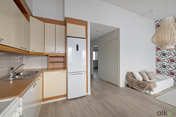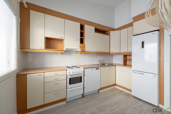 Vaaleassa keittiössä on hyvin tilaa niin ruuansäilytykseen kuin valmistamiseenkin. Ruokailulle on oma paikkansa ikkunan äärellä. Keittiön kaapin ovet uusittu 2015. Uudehko jääkaappi sekä astianpesukone.