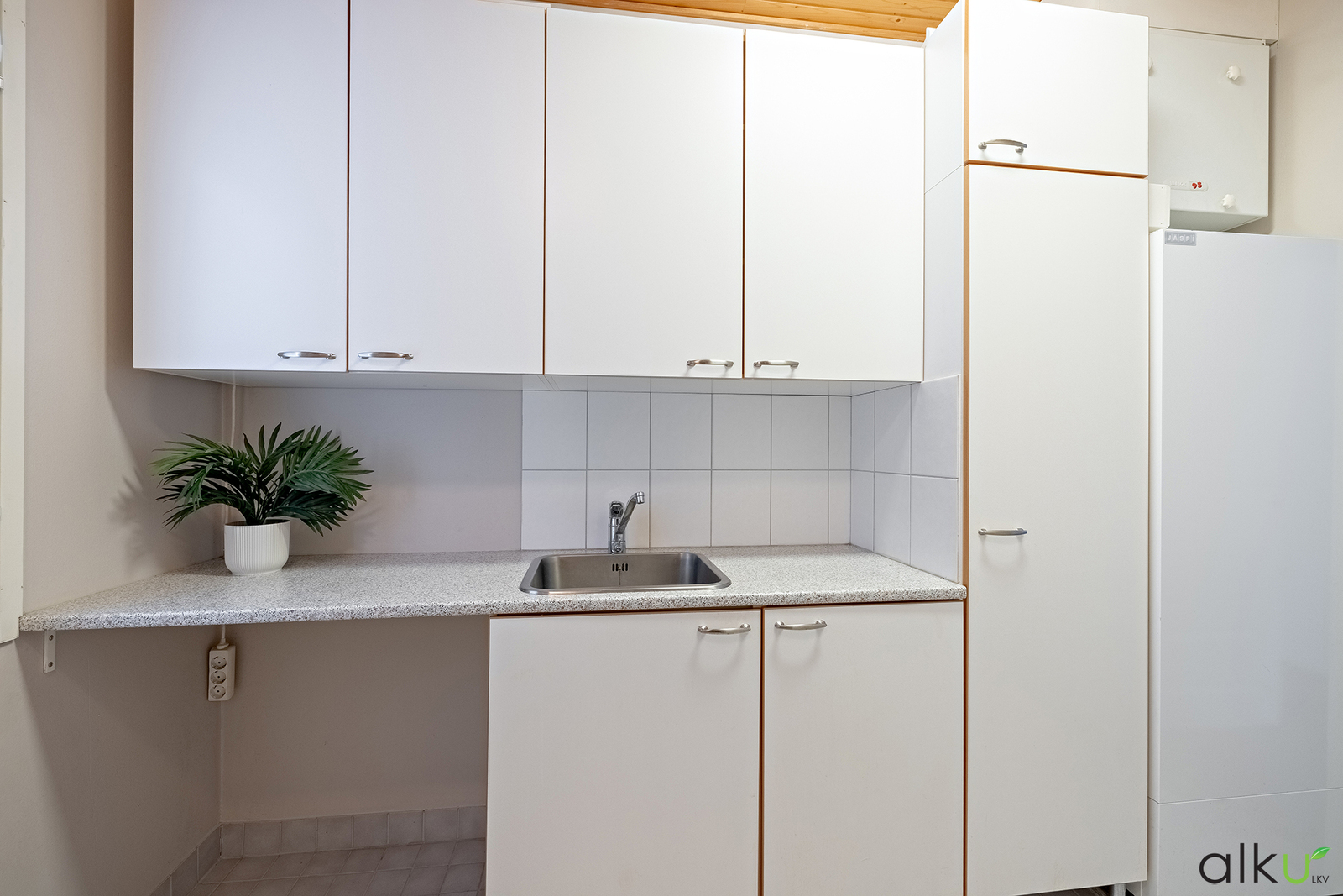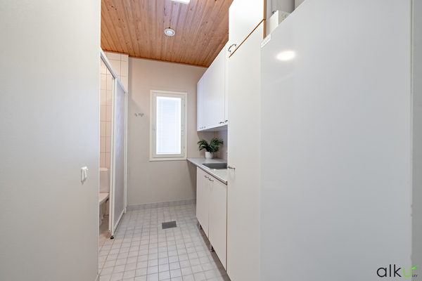 Tilavassa kodinhoitohuoneessa on paikka pesukoneelle ja pyykkihuollolle sekä tilasta löytyy myös kodin wc. Kodinhoitotilan kautta on käynti kylpyhuoneeseen ja tunnelmalliseen saunaan. Täällä kelpaa nautiskella ihanista löylyistä.