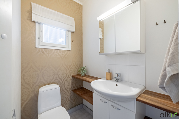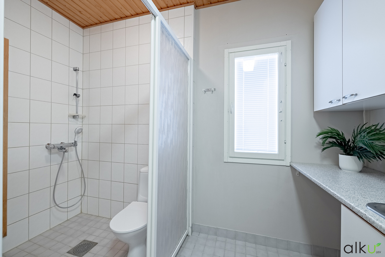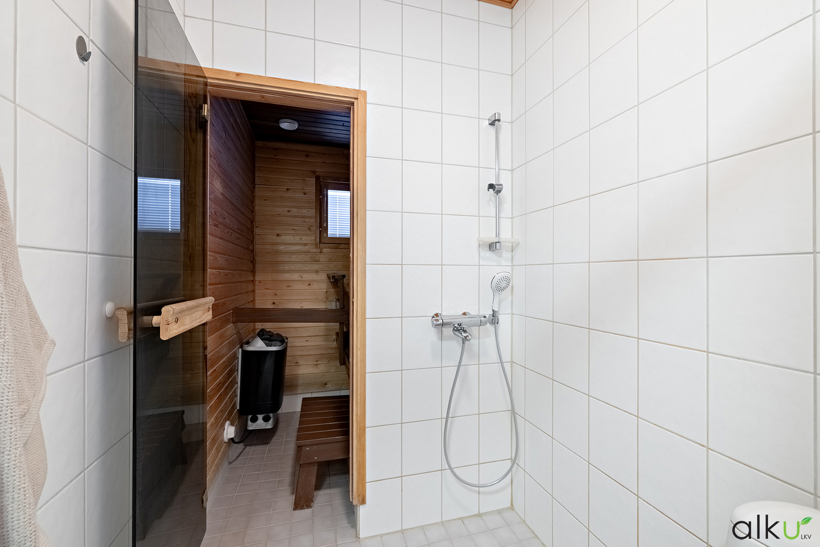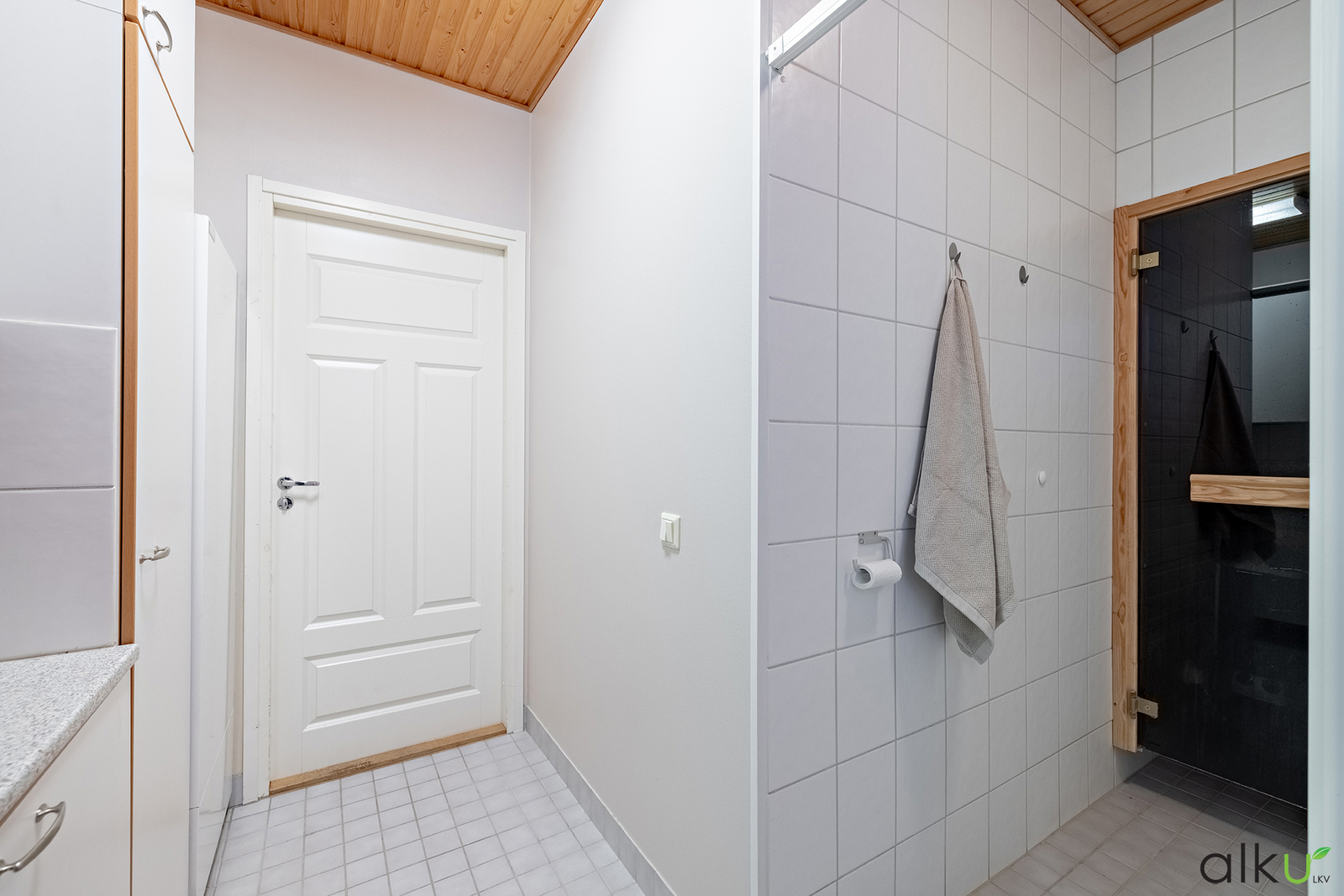 Erillisen kodinhoitohuoneen kautta on kulku vaalein sävyin laatoitettuun kylpyhuoneeseen ja tunnelmalliseen saunaan. Kylpyhuoneen yhteydessä myös wc.