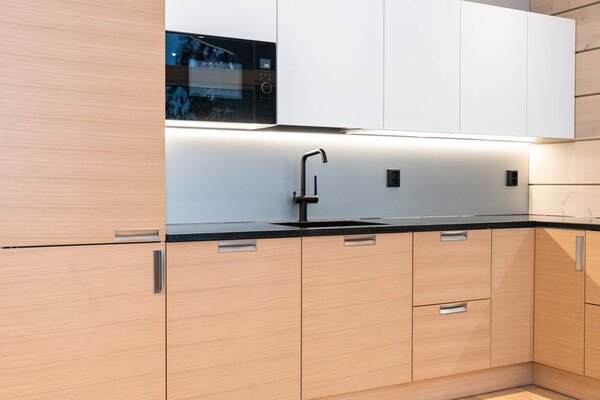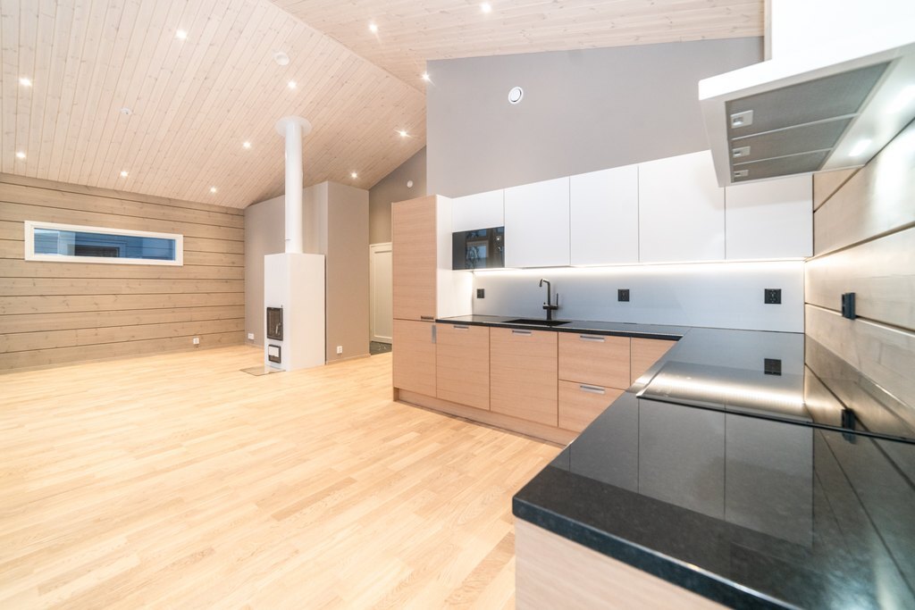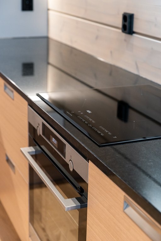 Upea Puustellin laadukas keittiö on hyvin varusteltu, vaalean puun ja mustan sekä valkoisen värimaailma sulautuu hyvin yhteen. Kodinkoneet ovat laadukkaat ja kalusteisiin integroidut. Upeat mustat kivitasot ovat erittäin tyylikkäät. Täällä on ilo kokkailla ruokaa tai nauttia pikku purtavaa. Keittiö ja olohuone ovat yhtenäisetä tilaa.