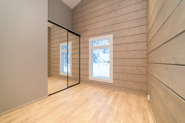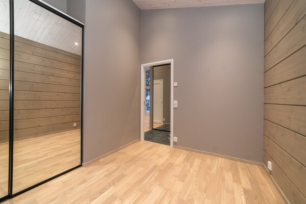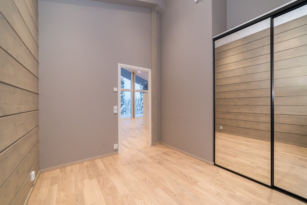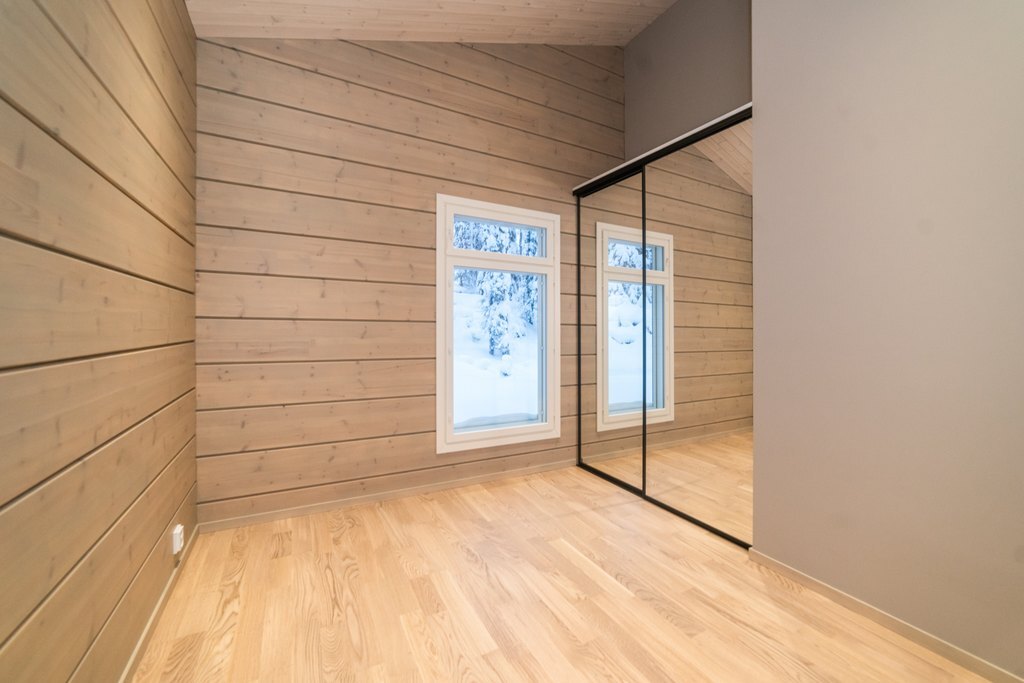 Huoneessa on peililiukuovikaapit, jotka tuovat selkeyttä ja tilantuntua huoneeseen.
