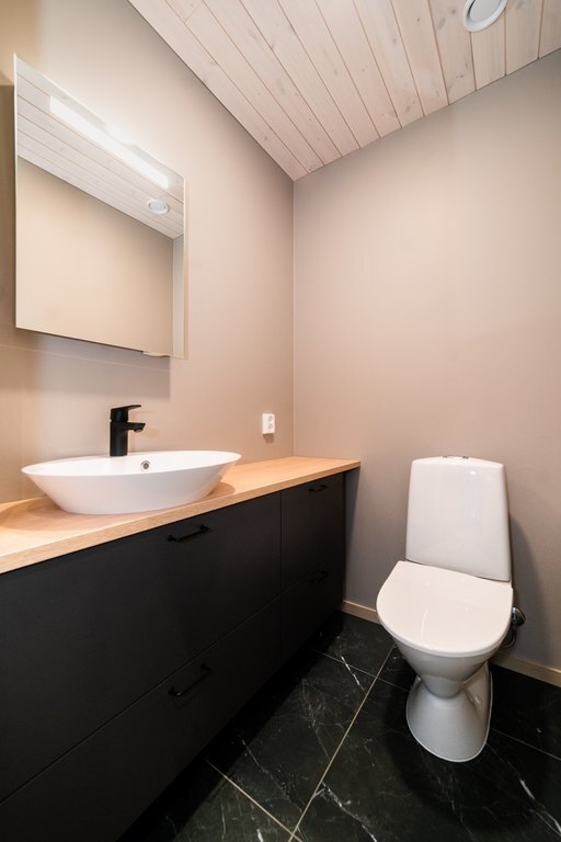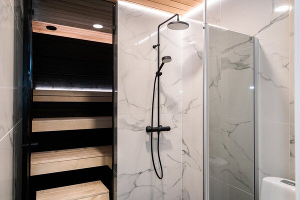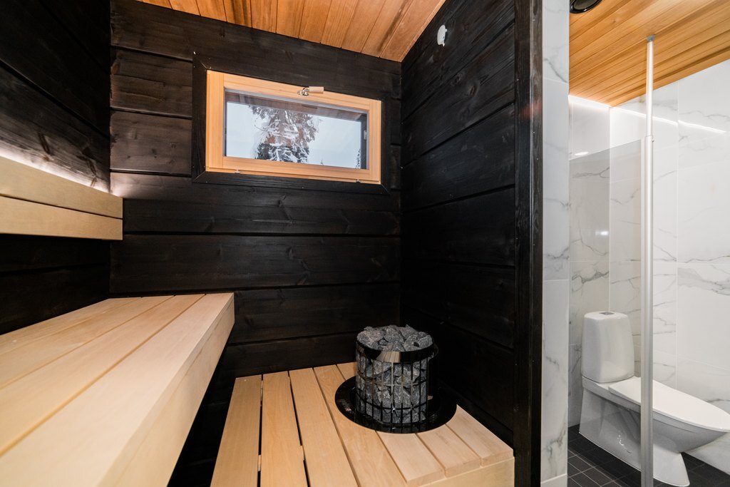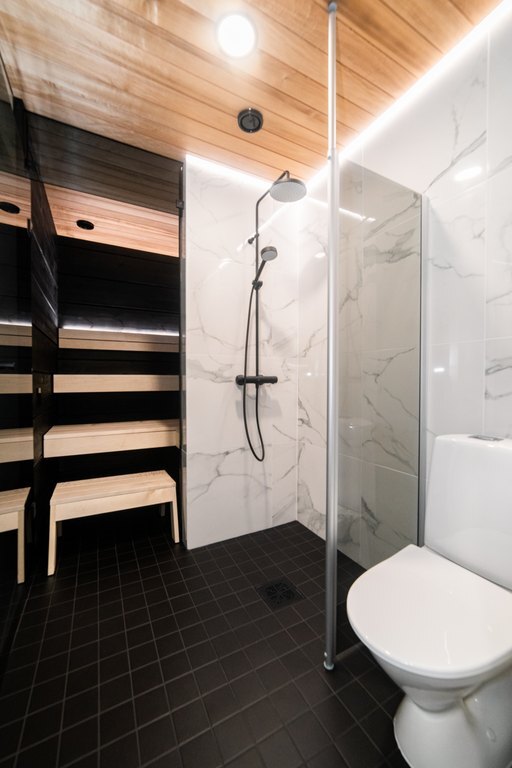 Kodinhoitohuoneesta on käynti sauna- ja kylpytilaan. Oma tunnelmallinen sauna rentouttaa ja tuo tietenkin lisämukavuutta lomailuun. Mustan ja valkoisen marmorin sävyttämä kylpyhuone on ylellinen ja sen yhteydestä löytyy mökin toinen wc. Eteisen yhteydessä on vielä erillinen wc-tila.
