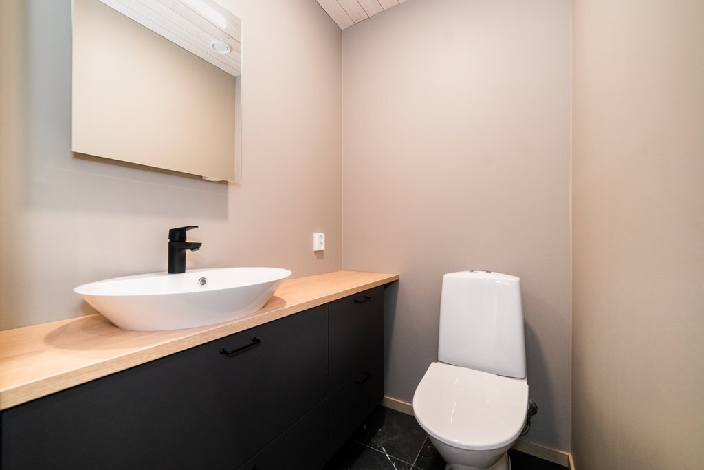 Huvilassa on kaksi wc-tilaa. Erillinen wc tila on yksinkertaisen kaunis, lattia tyylikkään tummilla marmorilaatoilla päällystetty, seinät maalattu vaaleanharmaiksi, pöytätaso vaaleaa puuta. Toinen wc löytyy kylpyhuoneen yhteydestä.