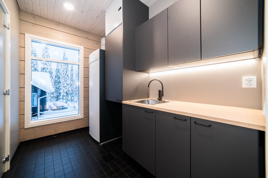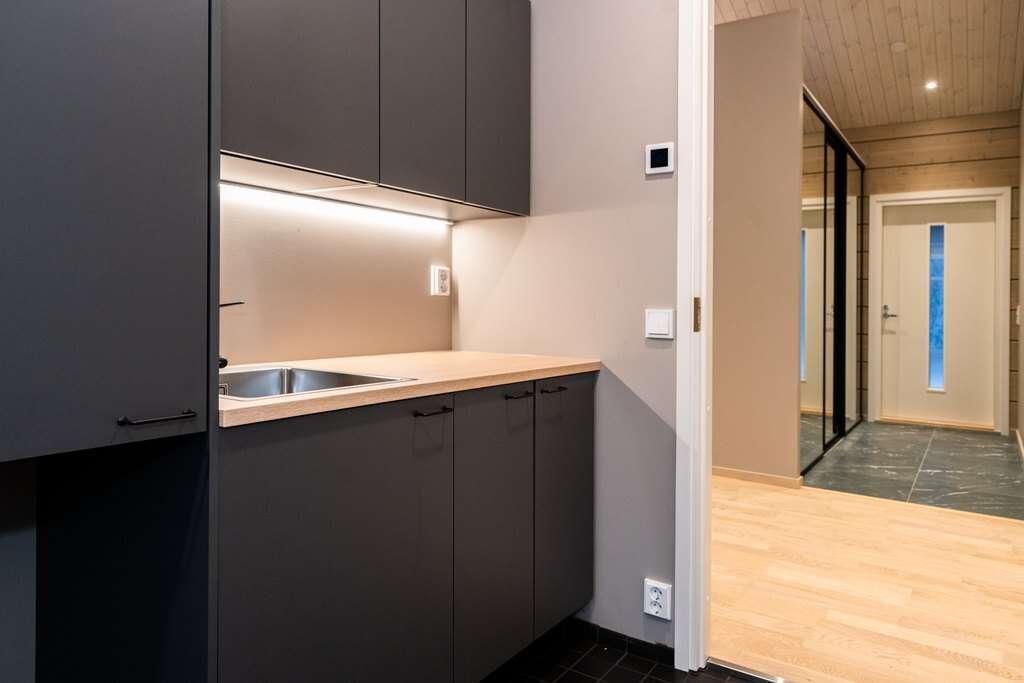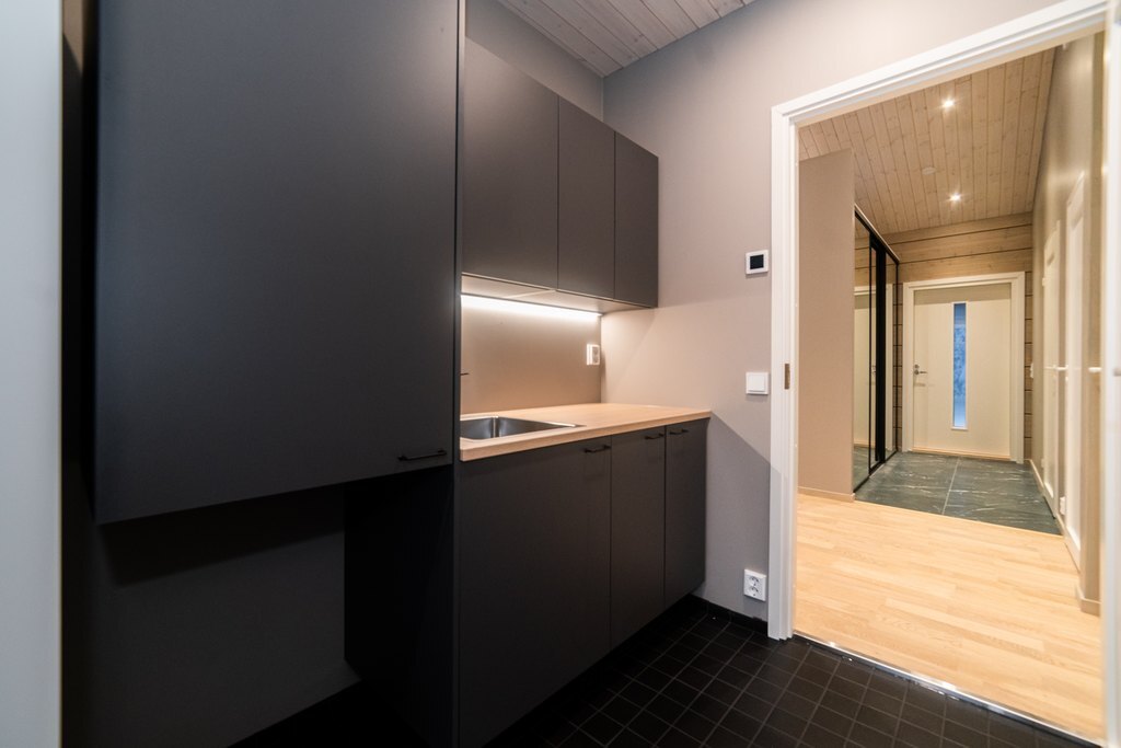 Kodihoitohuoneessa mustat kaapistot ja lattia, puun värinen pöytätaso. Seinät hirttä/vaalenaharmaaksi maalattu. Tilaa myös pyykinpesukoneelle.