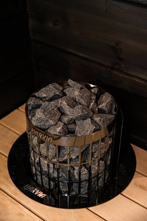Tunnelmallinen mustan ja vaalean puun verhoama sauna. Harvian upotettu kiuas tuo hyvät löylyt saunatuokioon.
