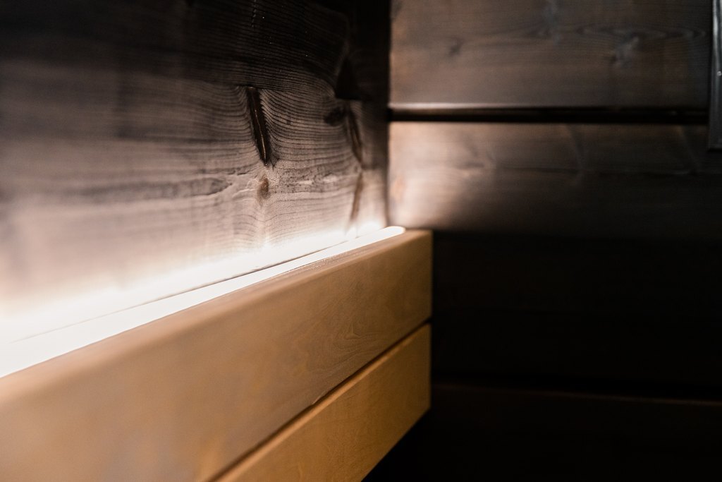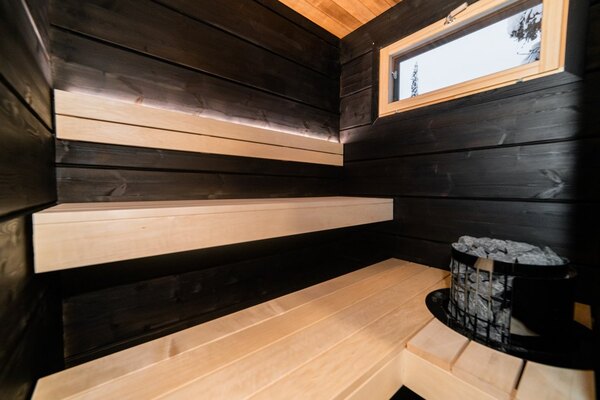 Mustan ja vaalean puun yhdistelmä saunassa on upea, kelpaa rentoutua.