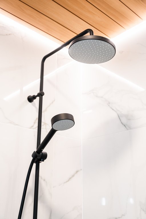 Mustat yksityiskohdat valkoisen marmoroidun kaakelin kanssa yhdistettynä luovat ylellisyyttä.