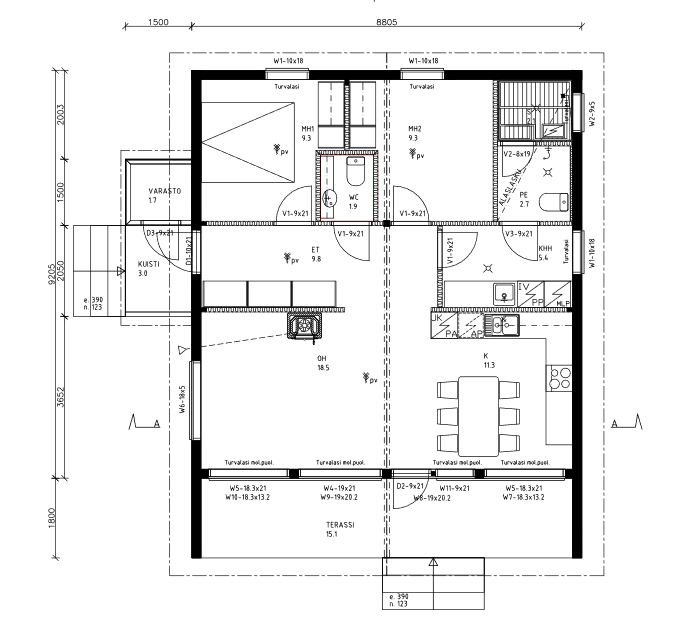 Huoneistoala 73,5m2. Lisäksi suuri n. 15m2 terassi, kuisti sekä erillinen varasto.