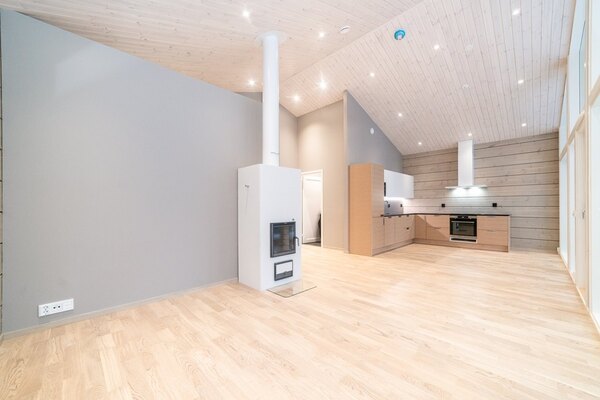 Upea olohuone-keittiötila mahtavine maisemineen on tämän huvilan sydän. Korkea katto ja koko seinän kokoinen ikkunapinta luo upeaa tunnelmaa. Olohuone-keittiön pinnat ovat harkittuja ja kauniisti toteutettuja. Lattia vaalean puun väristä, seinät osittain hirsipinnoilla, osittain vaaleanharmaaksi maalattuja. Olohuone-keittiöalueella on myös varaava takka. Olohuoneesta on käynti terassille.