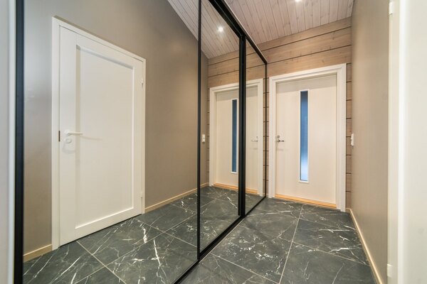 Tilava eteistila, jossa vaatteet ja varusteet saa näppärästi isojen peiliovien taakse.