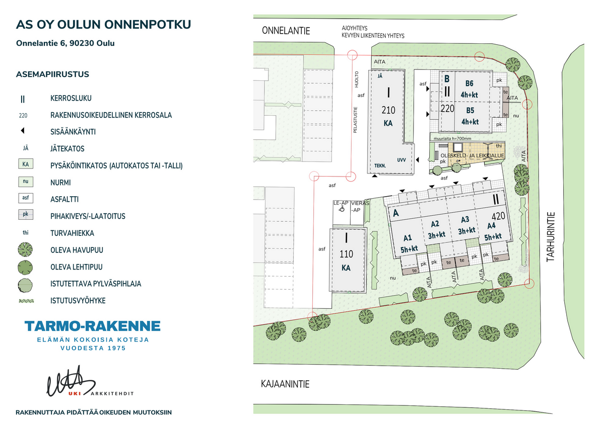 Tarmo-Rakenne Oy on alottanu rakentamaan Oulun Ranta-Kastelliin laadukkaan rivi-ja paritaloyhtiön, johon kuuluu kaksi kaksitasoista paritaloasuntoa (100m2) ja neljä rivitaloasuntoa (84-109,5m2). Tässä taloyhtiössä, As Oy Oulun Onnenpotkussa on vapaana vielä asuntoja, joiden kaikkiin ratkaisuihin, niin pohja- kuin materiaaliratkaisuihin voi vielä vaikuttaa!